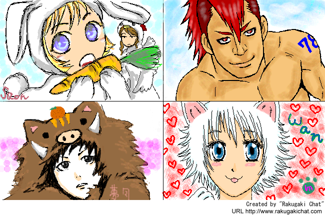 左上うさぎ・saonさん 右上うま・権助 左下いのしし・夢月さん 右下いぬ・mutsukiさん